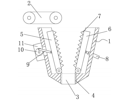 为生产的原材料、燃料或消费物品,这是固体废弃物资源化处理的基础。固体废弃物的产生 与排放,伴随着人类社会还在延续,社会化生产的生产、分配、交换、消费环节都会产生废弃 物;产品生命周期的产品的规划、设计、原材料采购、制造、包装、运输、分配和消费等环节也 会产生固体废弃物,即使是利用固体废弃物进行逆生产及相应的逆向物流过程也同样会产 生固体废弃物。 现有固废垃圾在后期处理前一般需要粉碎,目前一般的土壤破碎机粉碎效率差,且在 粉碎过程中容易发生堵塞现象。 固废土壤破碎设备,主要包括装置外壳、进料机构,所述进料机构位于装置外壳上方,所述装置外壳底部设置有排料孔,所述排料孔侧壁上设置有耐磨层,所述装置外壳内部一侧设置有破碎板A,另一侧设置有破碎板B,所述破碎板B与调节杆连接,所述破碎板A、破碎板B侧壁上设置有破碎齿,所述破碎板A与连接杆连接,所述连接杆与偏心轮连接,所述偏心轮与驱动电机连接。本发明结构简单,在使用时调节杆控制破碎板B的张角角度调节,同时驱动电机带动连接杆往复移动实现破碎板A可以对固废进行粉碎,这样使垃圾得到充分粉碎,且避免了发生堵塞现象,有效的提高了垃圾的粉碎效率。